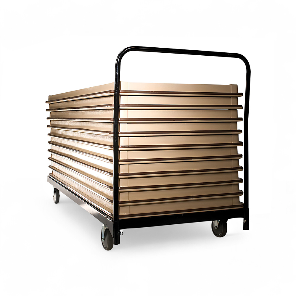 The TRESTLE TABLE CART will not just move 1 table, but 5, 10 or 20 tables at once. Tables can be easily stacked flat on this cart by a single staff member greatly reducing the time and cost of set ups and take downs.